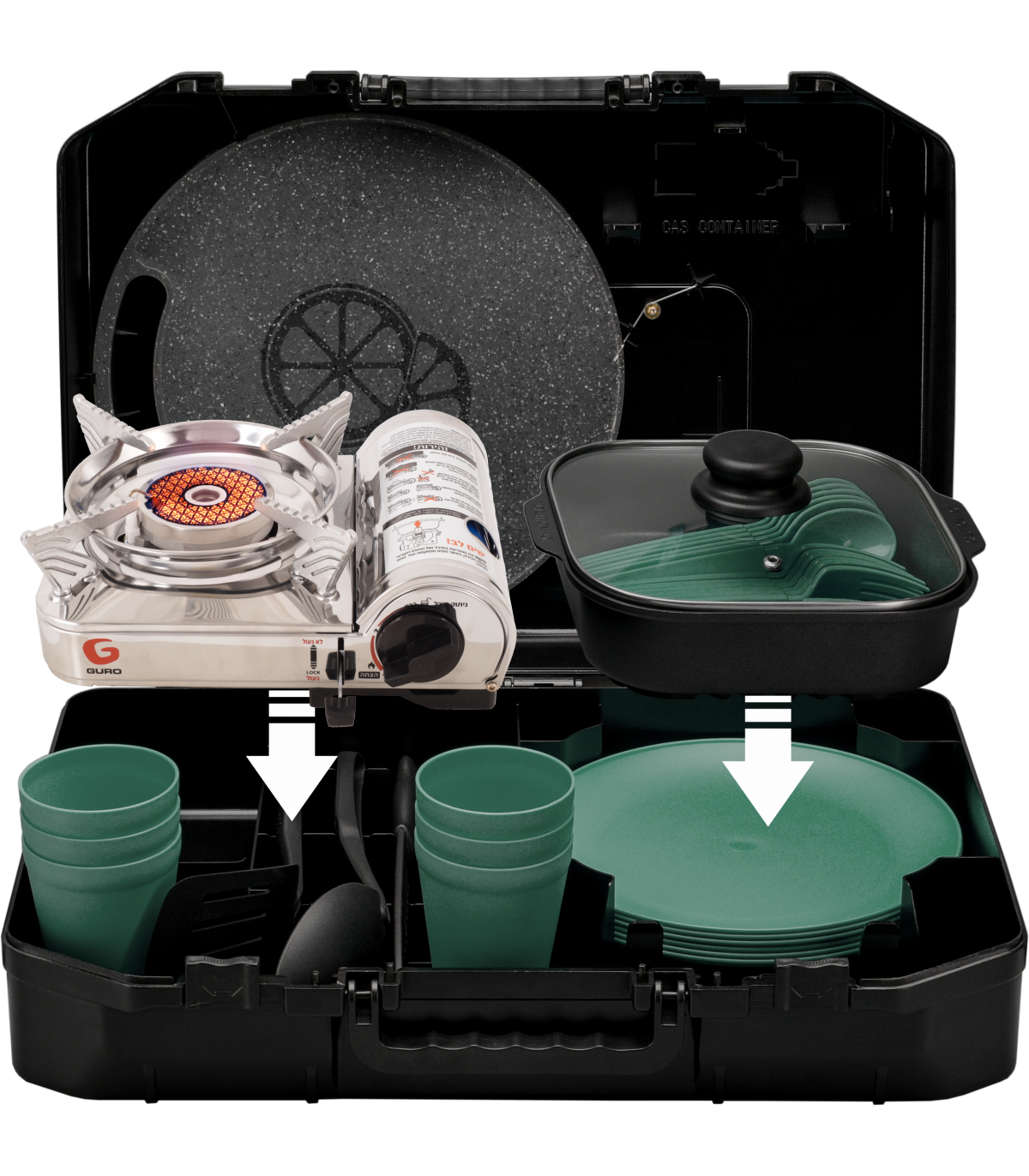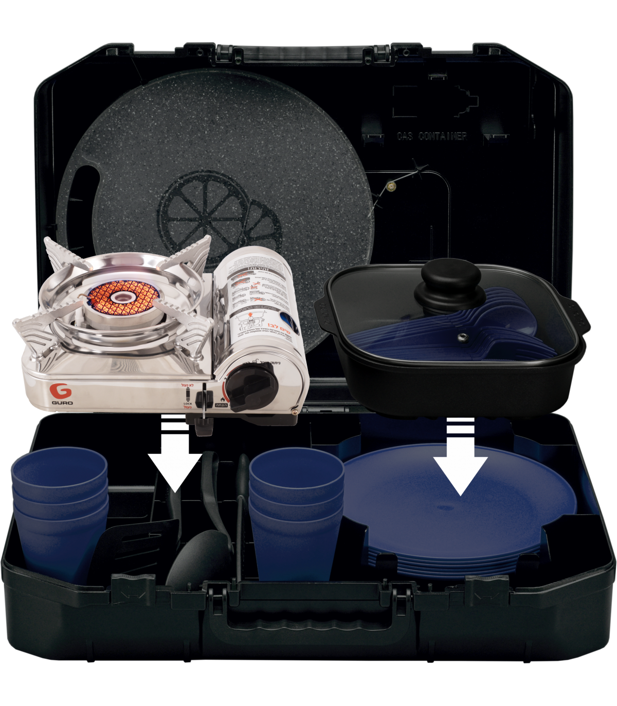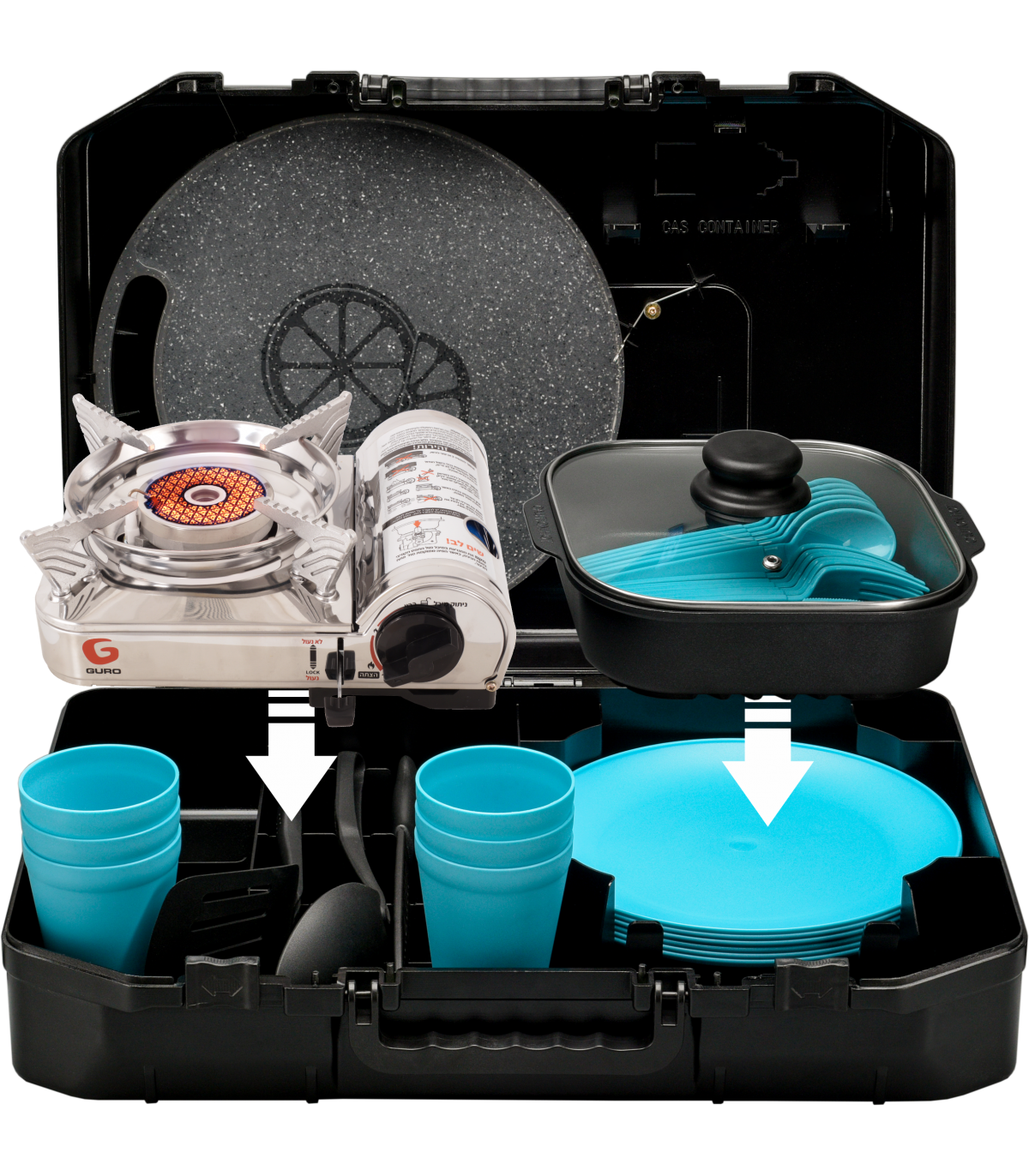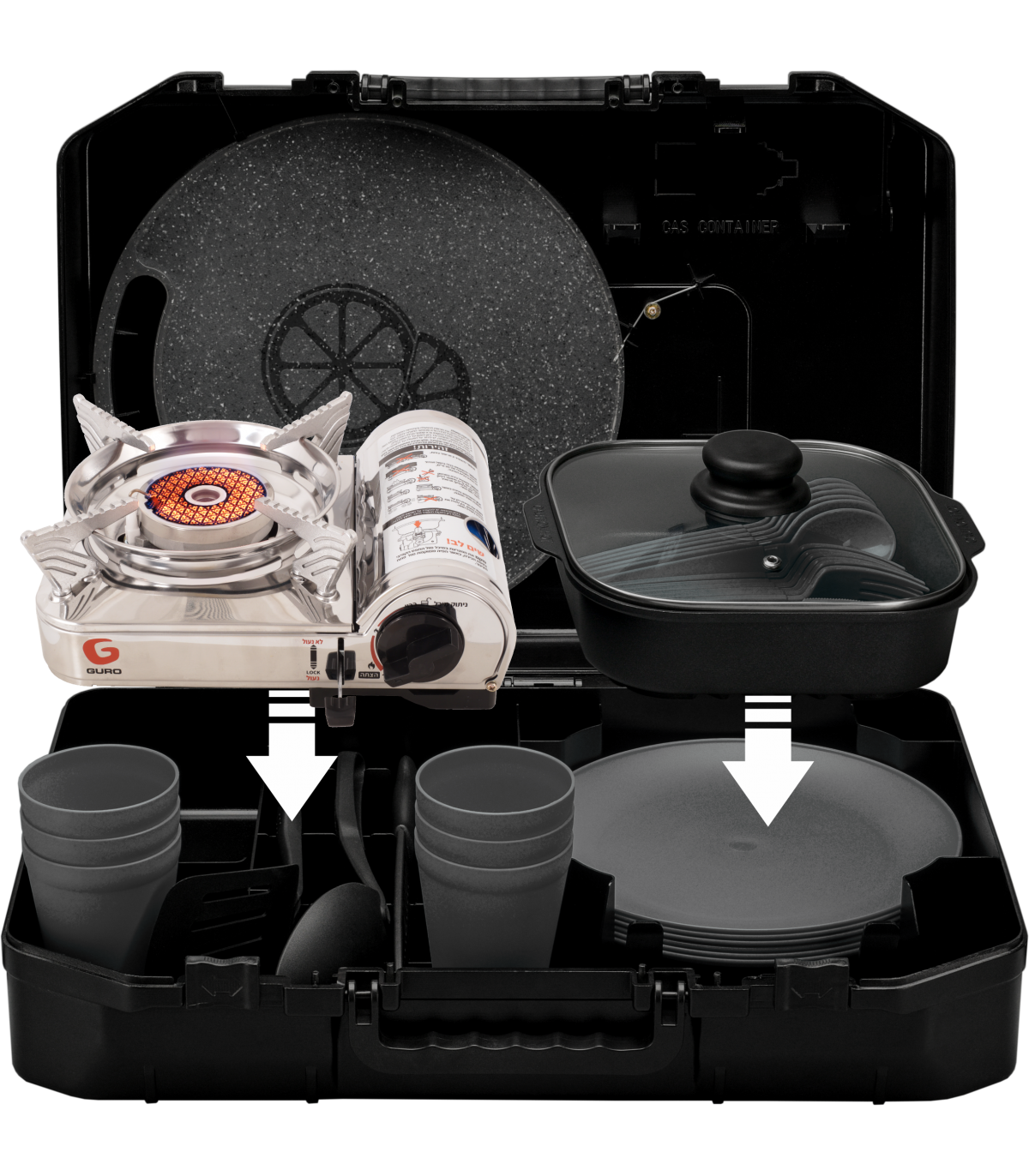 הערכה כוללת כירת גז ניידת איכותית עם הצתה אלקטרונית ומנגנון בטיחות אוטומטי, סיר בישול, 6 צלחות, 6 סטים של סכום (סכין, מזלג וכפית), משטח חיתוך, סכין חיתוך, כף הגשה, תרווד, קופסאות תבלינים – והכול בקייס קומפקטי לנשיאה קלה.